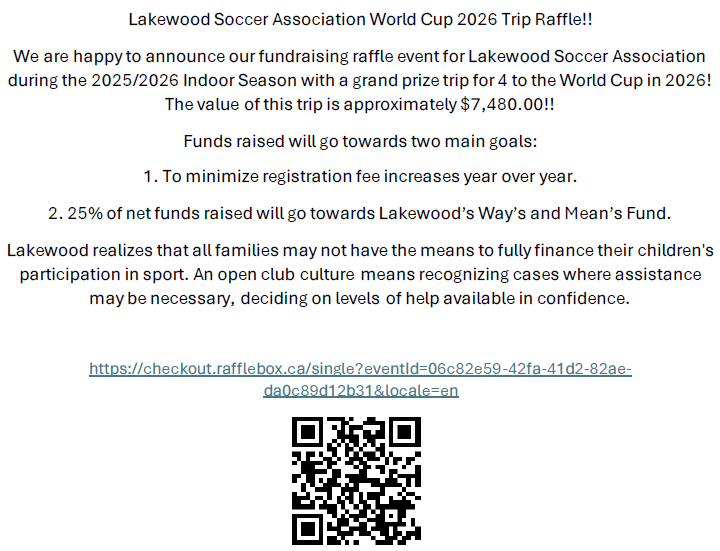 Proceeds from this raffle go towards supporting the Lakewood Ways & Means Fund, which helps ensure every player has equal access to soccer programming and opportunities, regardless of financial barriers.